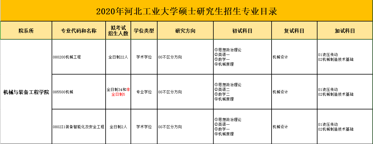 河工大考研辅导班:2020年河北工业大学考研招生专业目录-机械与装备工程学院