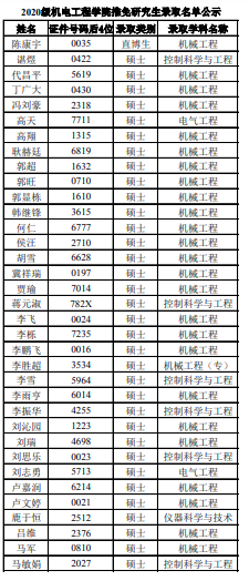 根据研究生院有关规定,现对机电工程学院2020级推免生录取名单予以公示,公示期为10.14-10.23(10天)。