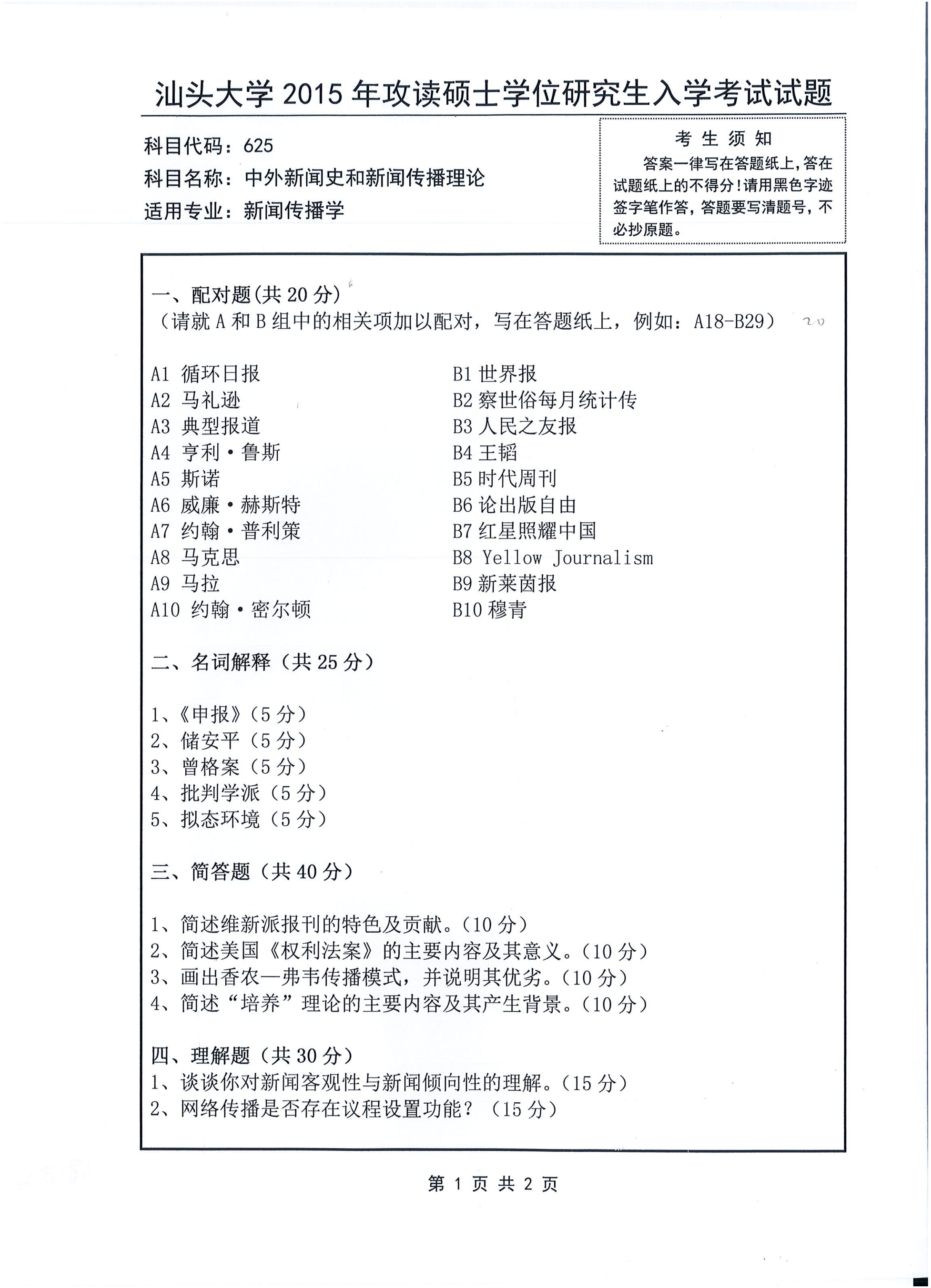 汕头大学考研辅导班:2015年汕头大学625中外新闻史和新闻传播理论考研真题