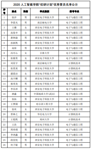 西电考研辅导班:2020年西安电子科技大学人工智能学院“优研计划”夏令营优秀营员名单