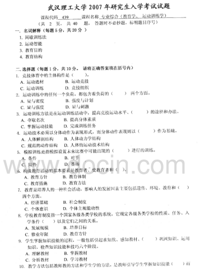 2020-2021年武汉理工考研辅导班:武汉理工大学617体育教育专业综合2007年考研真题