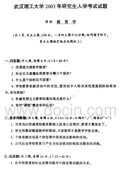 2020-2021年武汉理工考研辅导班:武汉理工大学618教育学2003年考研真题