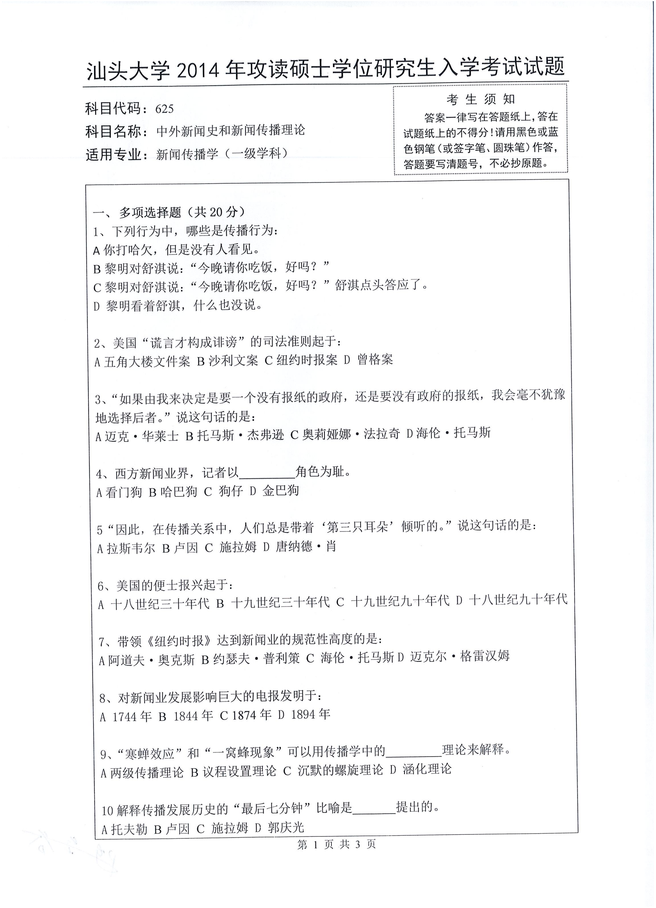 汕头大学考研辅导班:2014年汕头大学考研625中外新闻史和新闻传播理论真题
