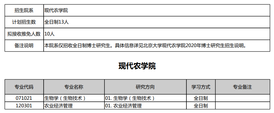 北京大学考博辅导班:北京大学现代农学院2020年博士研究生招生专业、研究方向及招收名额