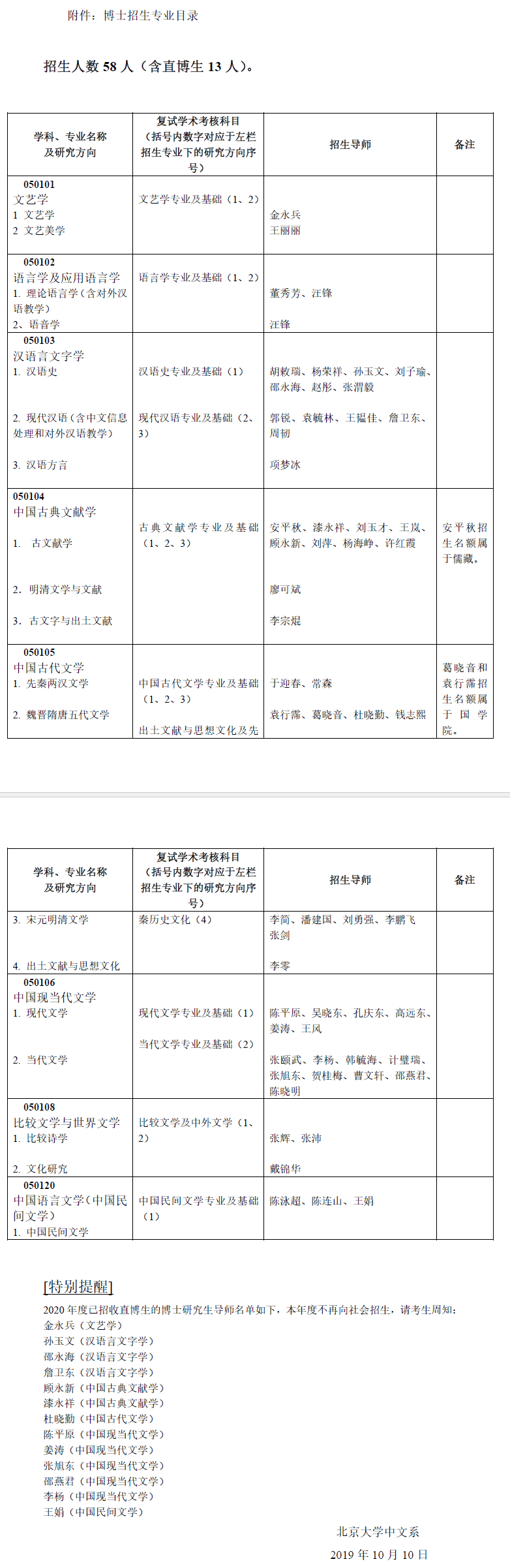 北京大学中国语言文学系2020年招收攻读博士学位研究生采用直接攻读博士学位和“申请-考核制”两种招生方式。“申请-考核制”申请人须按照北京大学博士研究生招生简章和中文系相关要求报名并提交申请材料。具体办法如下: