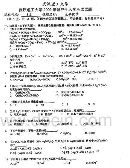 2020-2021年武汉理工考研辅导:武汉理工大学623无机化学2009年考研真题
