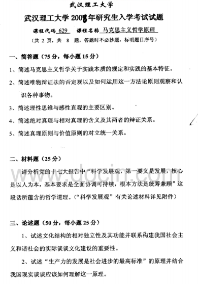 2020-2021年武汉理工考研辅导:武汉理工大学629马克思主义哲学原理2009考研真题