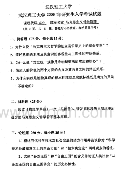 2020-2021年武汉理工考研辅导:武汉理工大学629马克思主义哲学原理2009考研真题