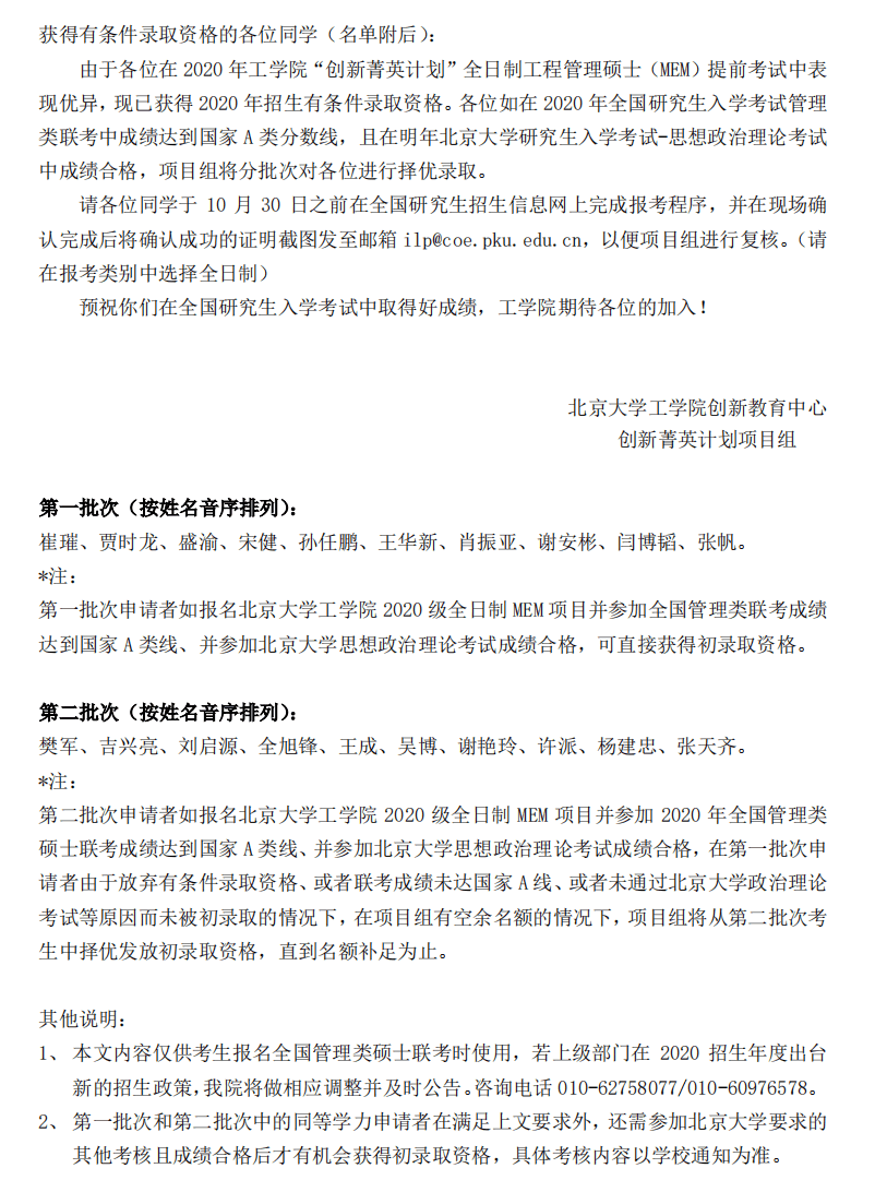 北京大学考博辅导班:2020年北京大学工院程管理硕士(全日制)招生有条件录取名单