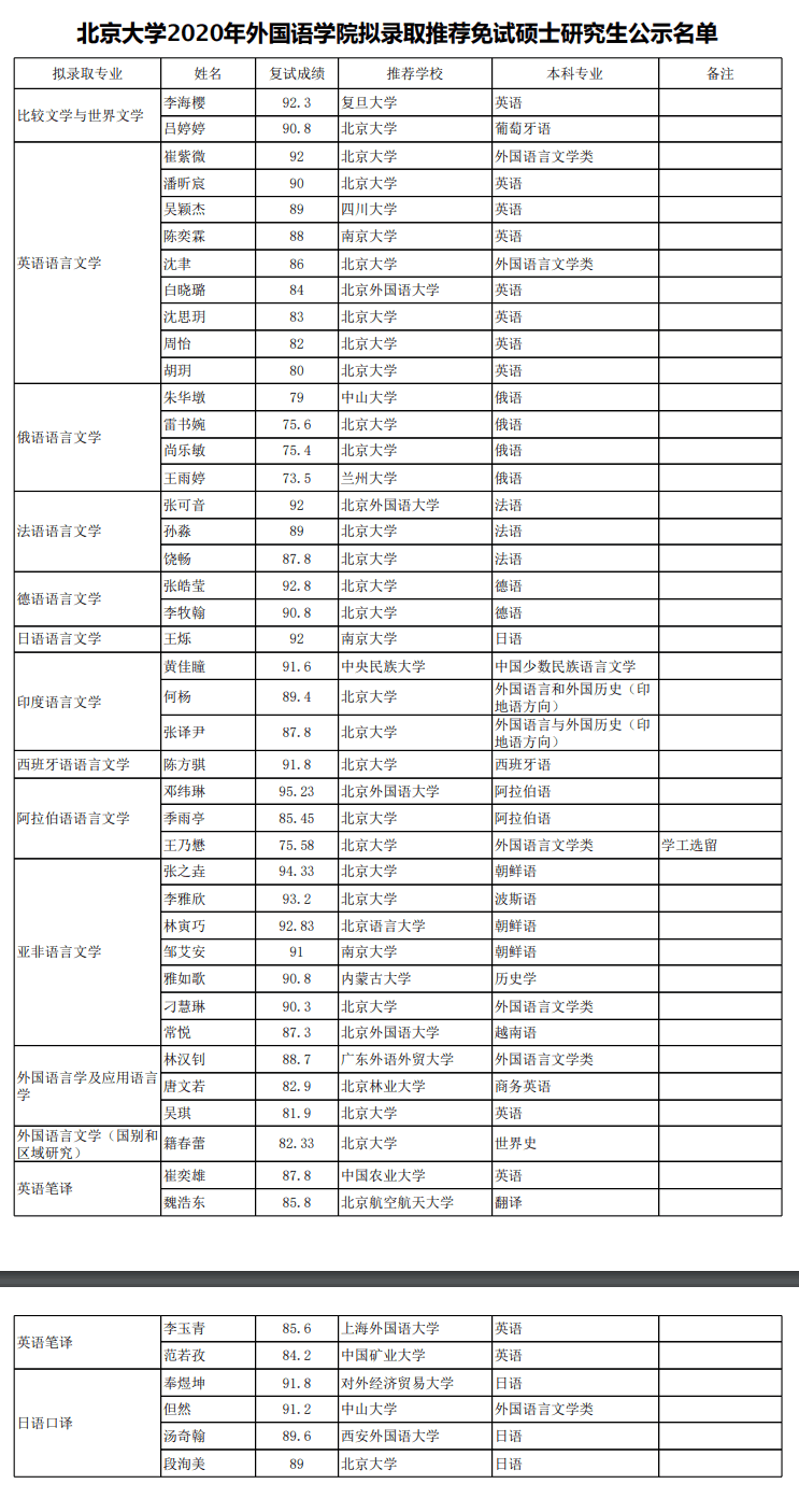北京大学考研辅导班:北京大学外国语学院2020年拟录取推荐免试硕士研究生公示名单