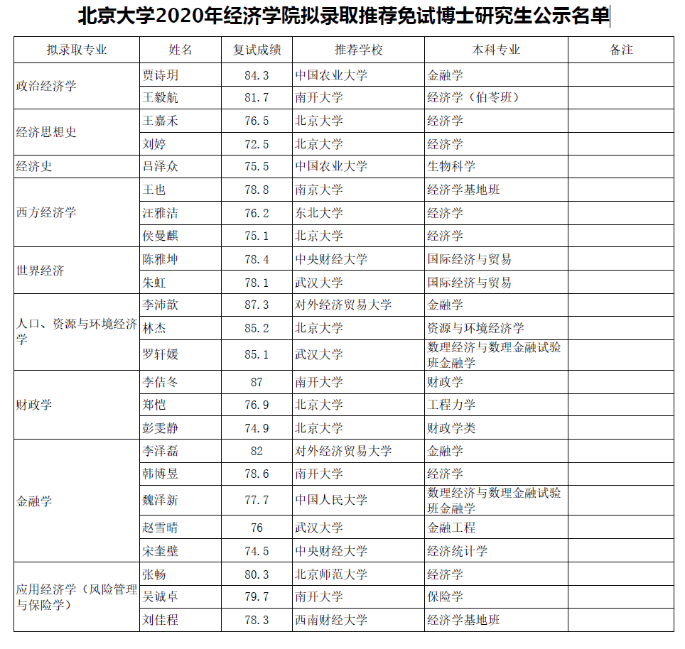 北京大学考博辅导班:北京大学经济学院2020年拟录取推荐免试博士研究生公示名单