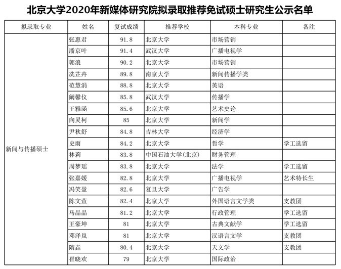 北京大学考研辅导班:2020年北京大学新媒体研究院拟录取推荐免试研究生名单公示