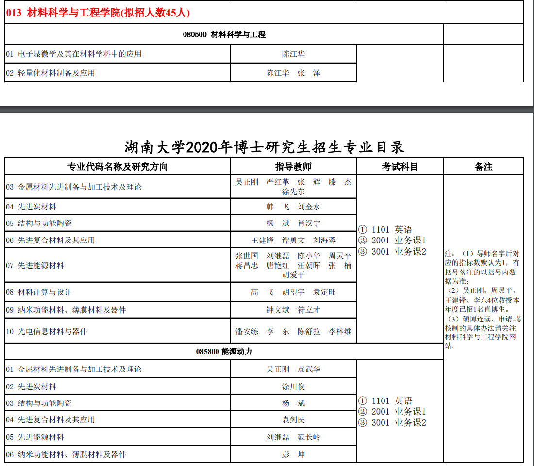 2020湖南大学材料科学与工程学院博士研究生招生专业目录