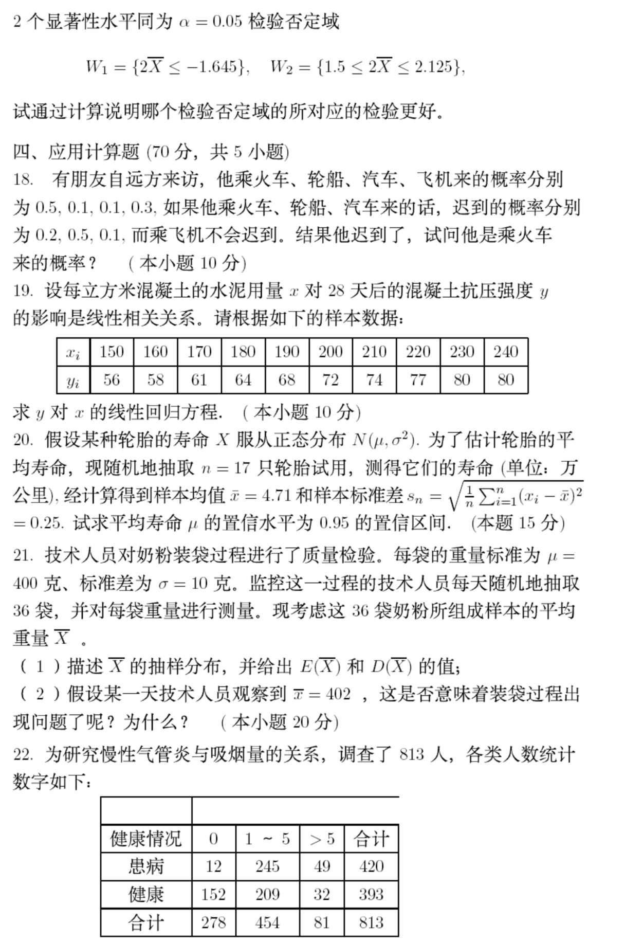 统计推断理论包括:事件及关系和运算、事件的概率、条件概率和全概公式、离散型随机变量的分布列和分布函数,二项分布和泊松分布;连续型随机变量的概率密度函数和分布函数,均匀分布、正态分布和指数分布随机变量的期望与方差。随机变量及其概率分布,大数定律及中心极限定理,三个常用的抽样分布( χ2 —分布、t —分布和F —分布); 参数的点估计(矩估计和极大似然估计)及其优良性评判,正态总体参数的区间估计; 假设检验的一般方法, 两类错误概率的意义与计算,总体均值和方差的假设检验(u-检验、t-检验、χ2 -检验、F-检验法),了解皮尔逊拟合检验, 置信区间与假设检验之间的关系。(70 分)