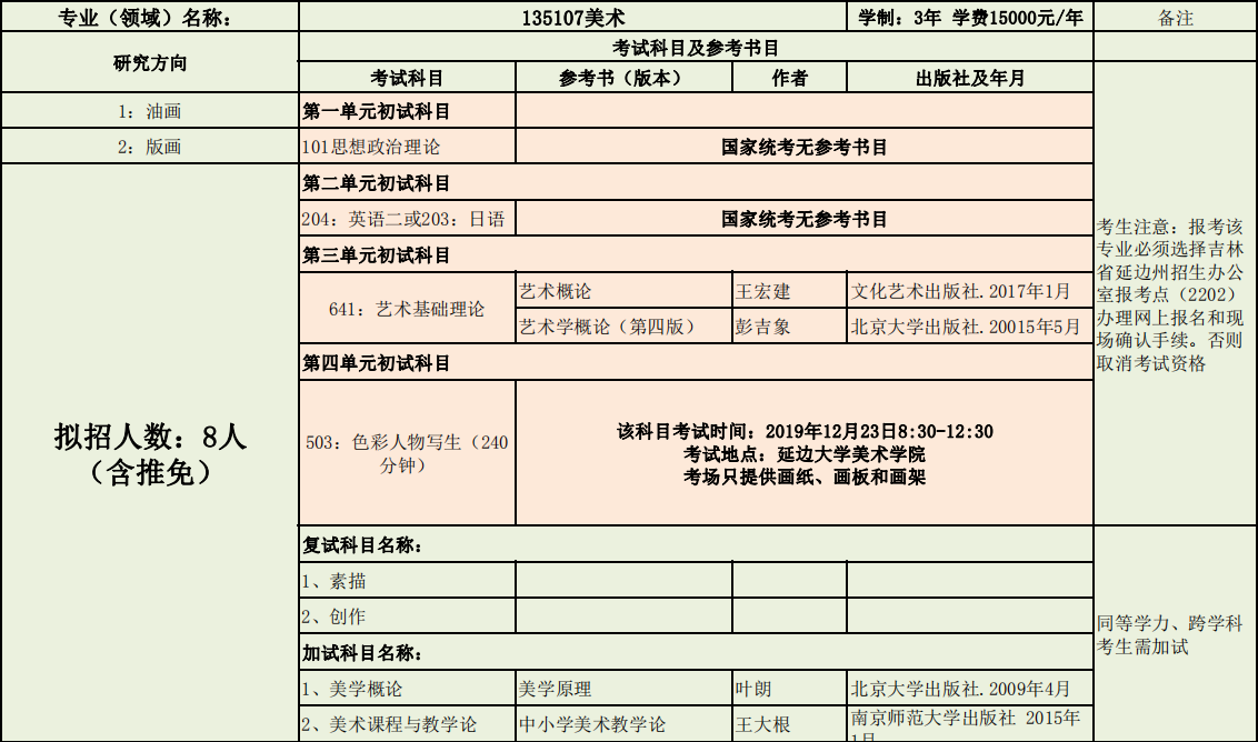 延边大学美术学院2020年度招收攻读硕士学位研究生专业目录表(学术型)