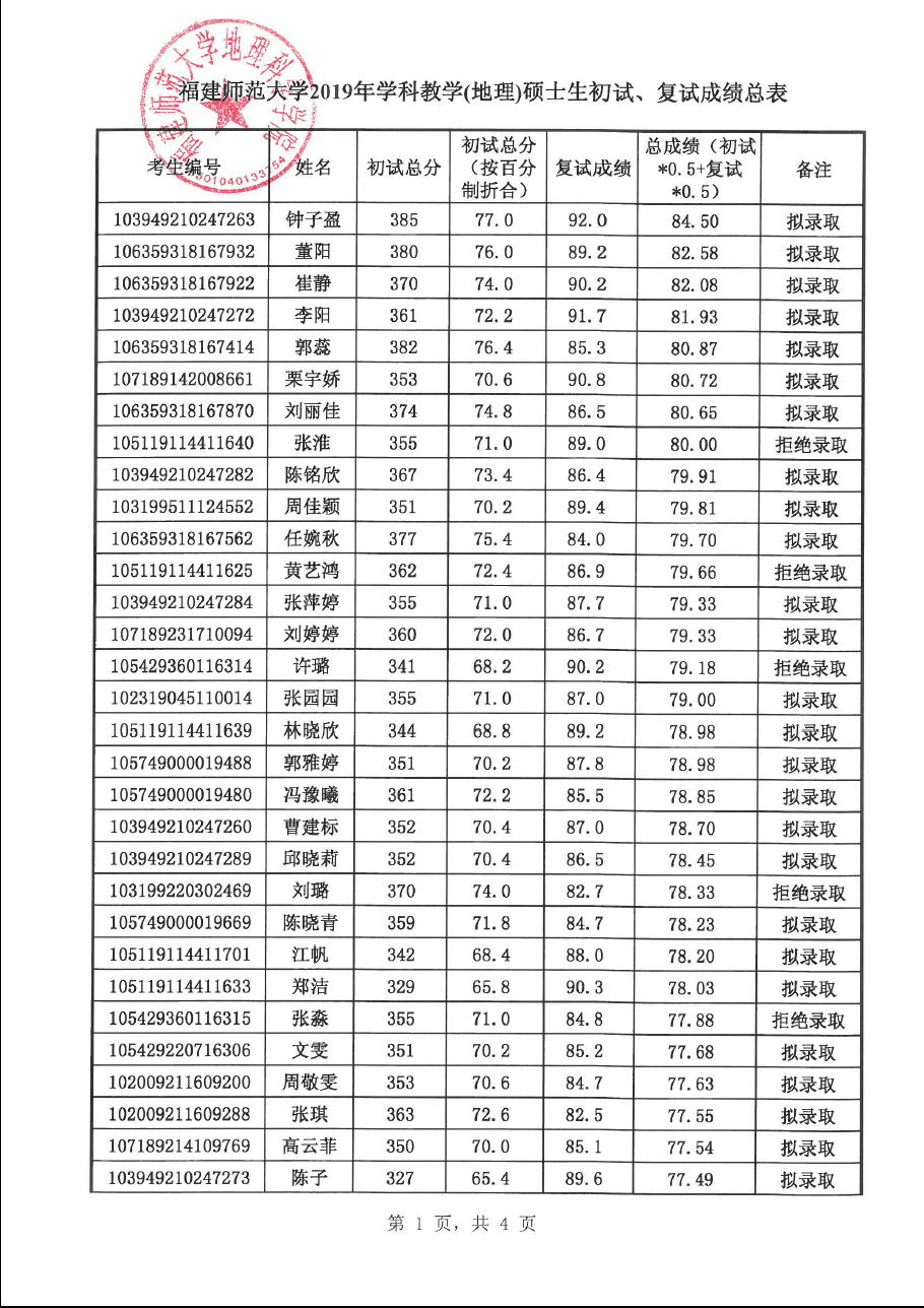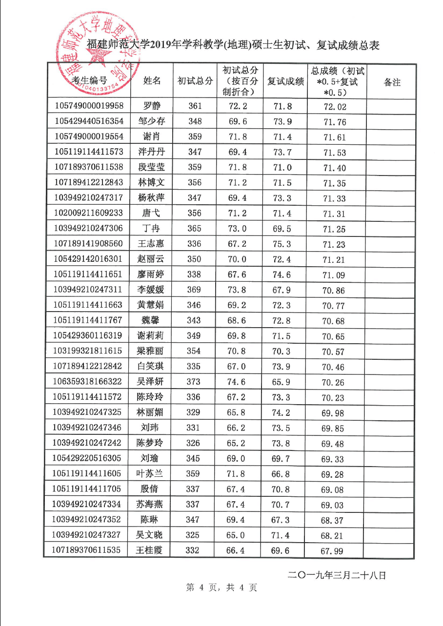 福建师范大学考研辅导班:福建师范大学2019年学科教学(地理)硕士生初试、复试成绩汇总表