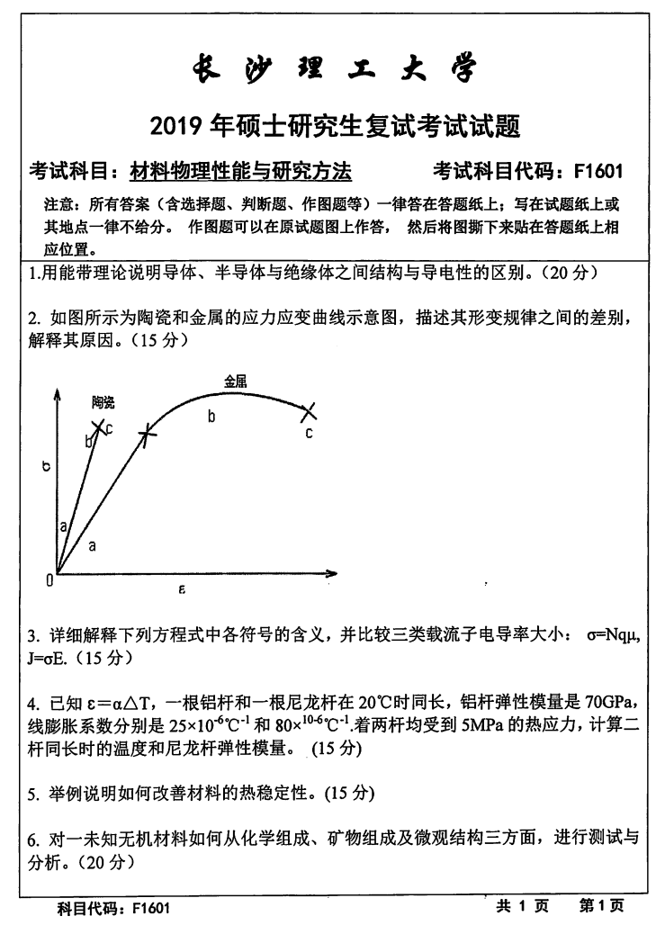 长沙理工大学考研辅导班:2019年材料科学与工程学院考研复试F1601材料物理性能与研究方法考试真题