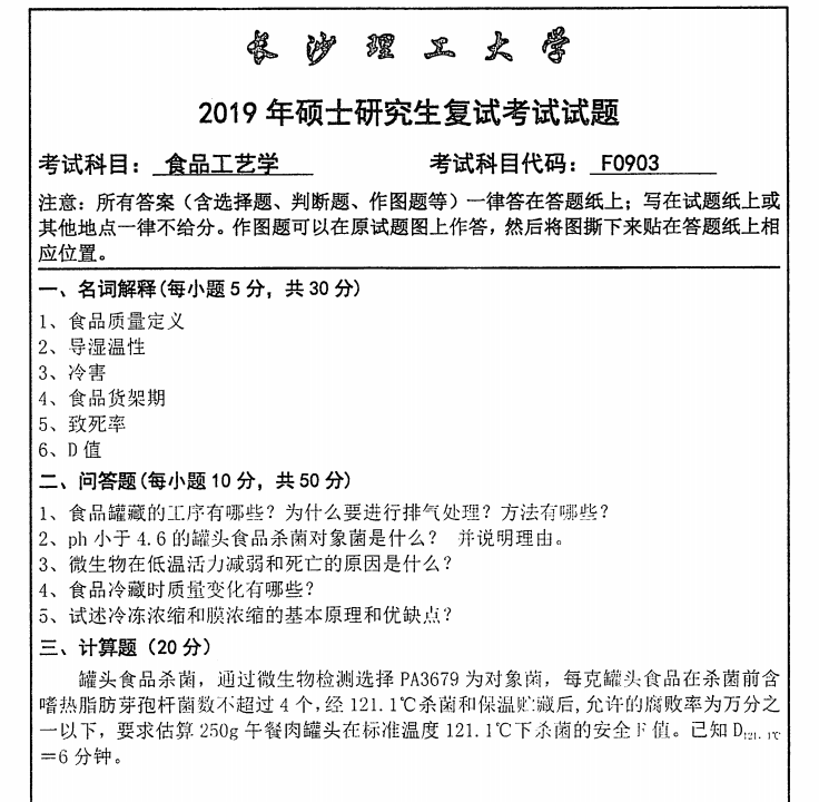 长沙理工大学考研辅导班:2019年长沙理工大学化学与生物工程学院考研复试F0903食品工艺学科目考试真题