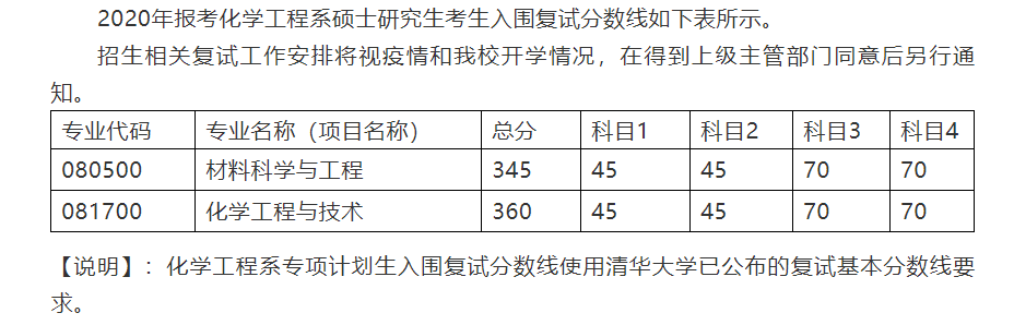 清华大学考研辅导班:清华大学化学工程系2020年硕士研究生考生入围复试分数线