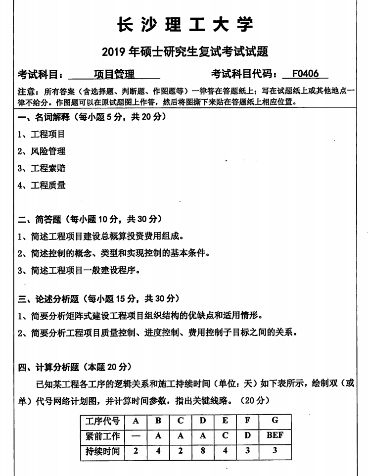 长沙理工大学考研辅导班:2019年长沙理工大学水利工程学院学院考研复试F0406项目管理科目考试真题
