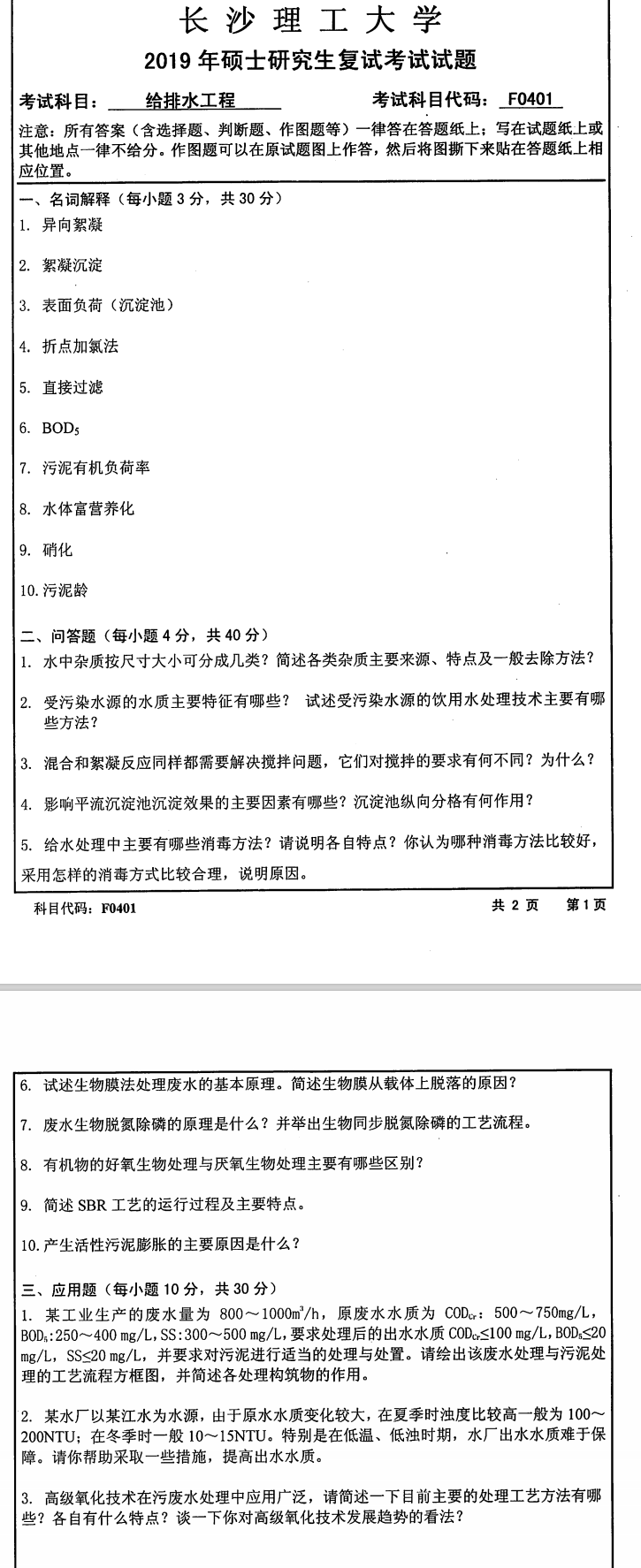 长沙理工大学考研辅导班:2019年长沙理工大学水利工程学院学院考研复试F0401给排水工程科目考试真题