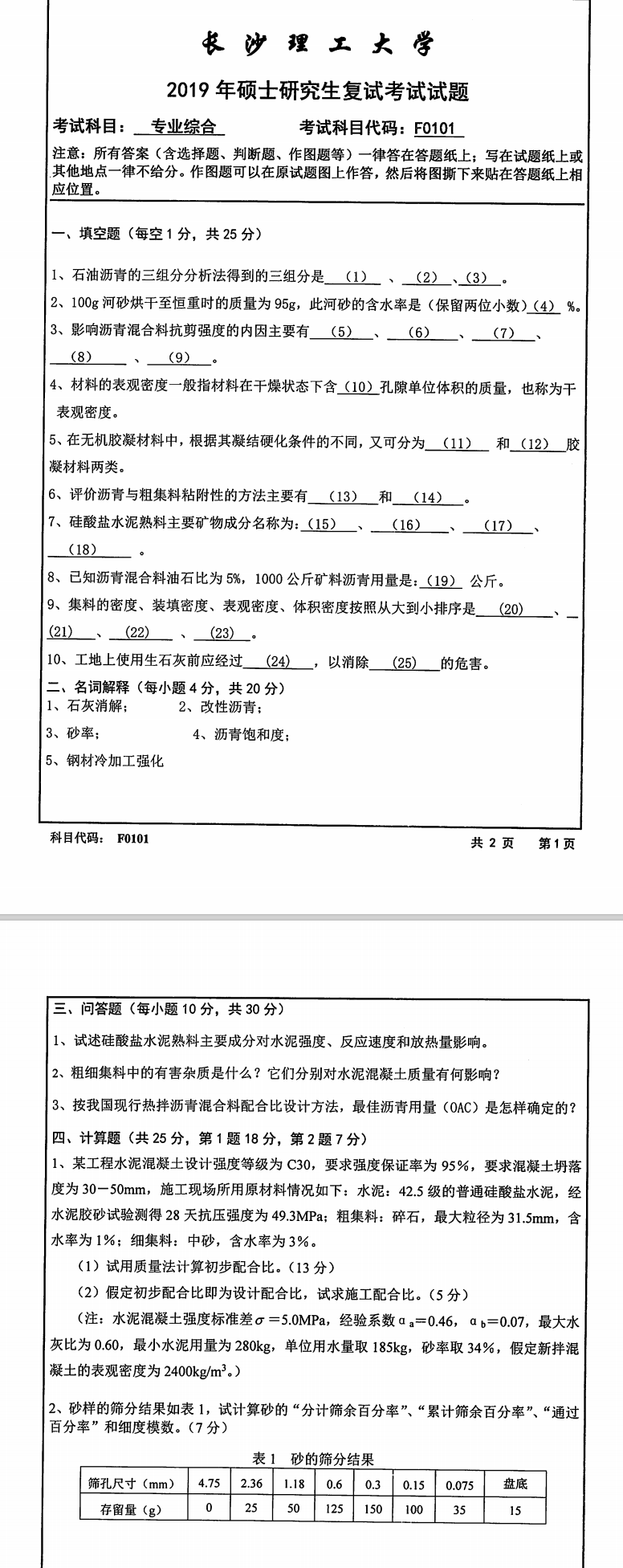 长沙理工大学考研辅导班:2019年长沙理工大学交通运输工程学院考研复试F0101专业综合考试真题