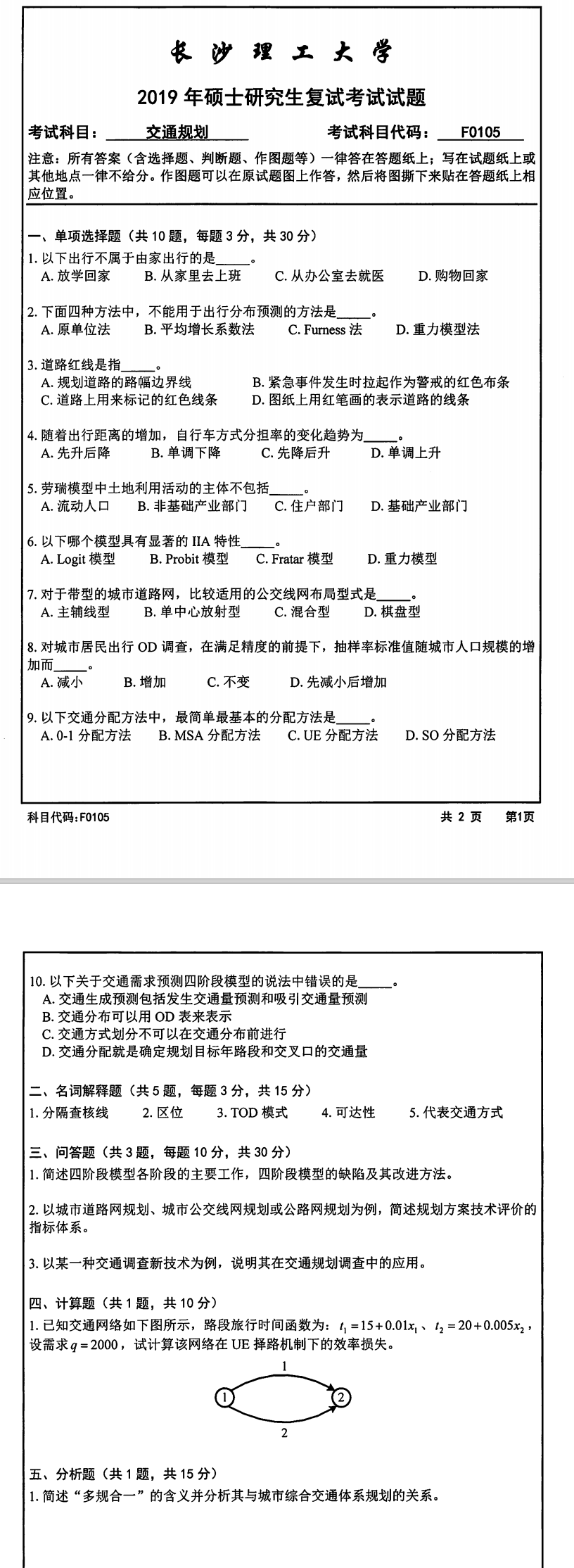 长沙理工大学考研辅导班:2019年长沙理工大学交通运输工程学院考研复试F0105交通规划考试真题