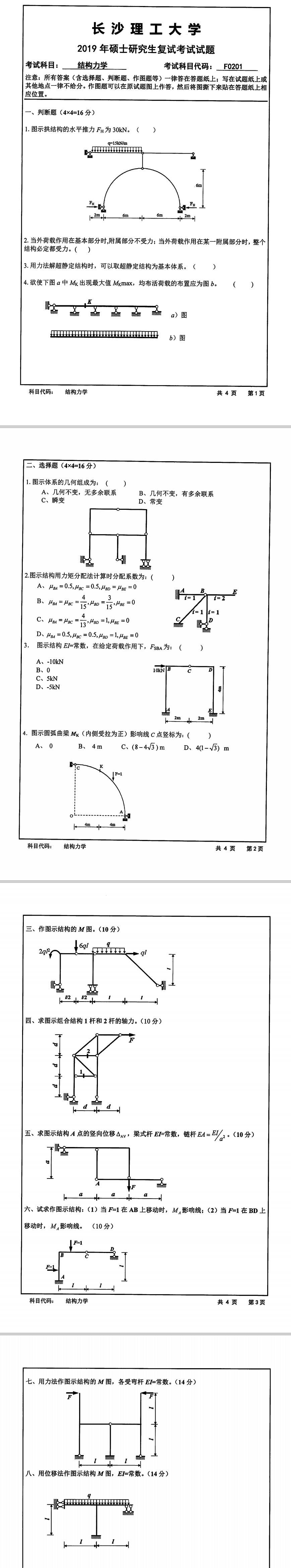 长沙理工大学考研辅导班:2019年长沙理工大学土木与建筑学院学院考研复试F0201结构力学科目考试真题