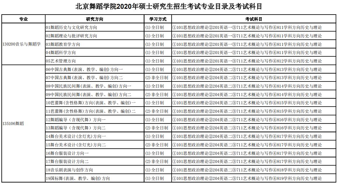 北京舞蹈学院考研辅导班:2020年北京舞蹈学院硕士研究生招生考试专业目录及考试科目
