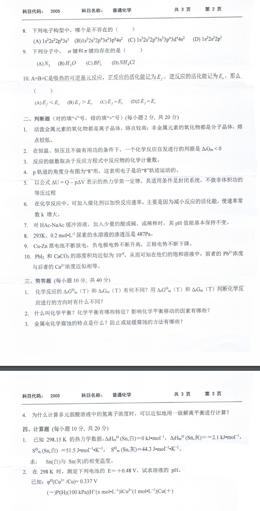 西南科技大学考博辅导班:2019年西南科技大学2005普通化学考博真题分享