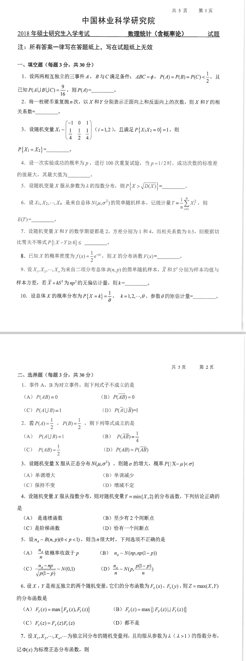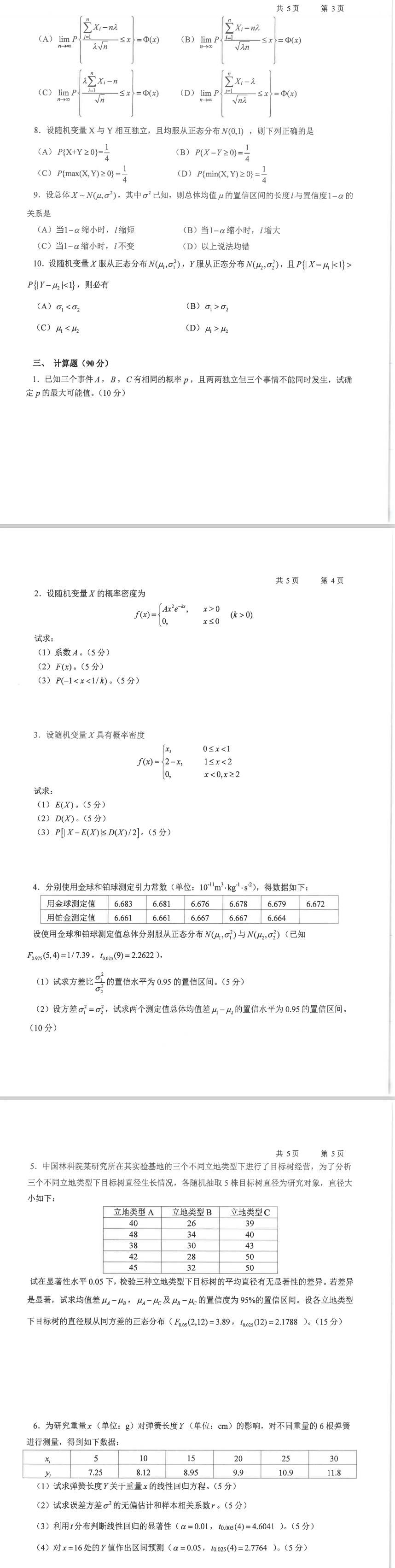 林科院考研辅导班:2018年中国林业科学研究院考研专业课701数理统计(含概率论)招生考试真题