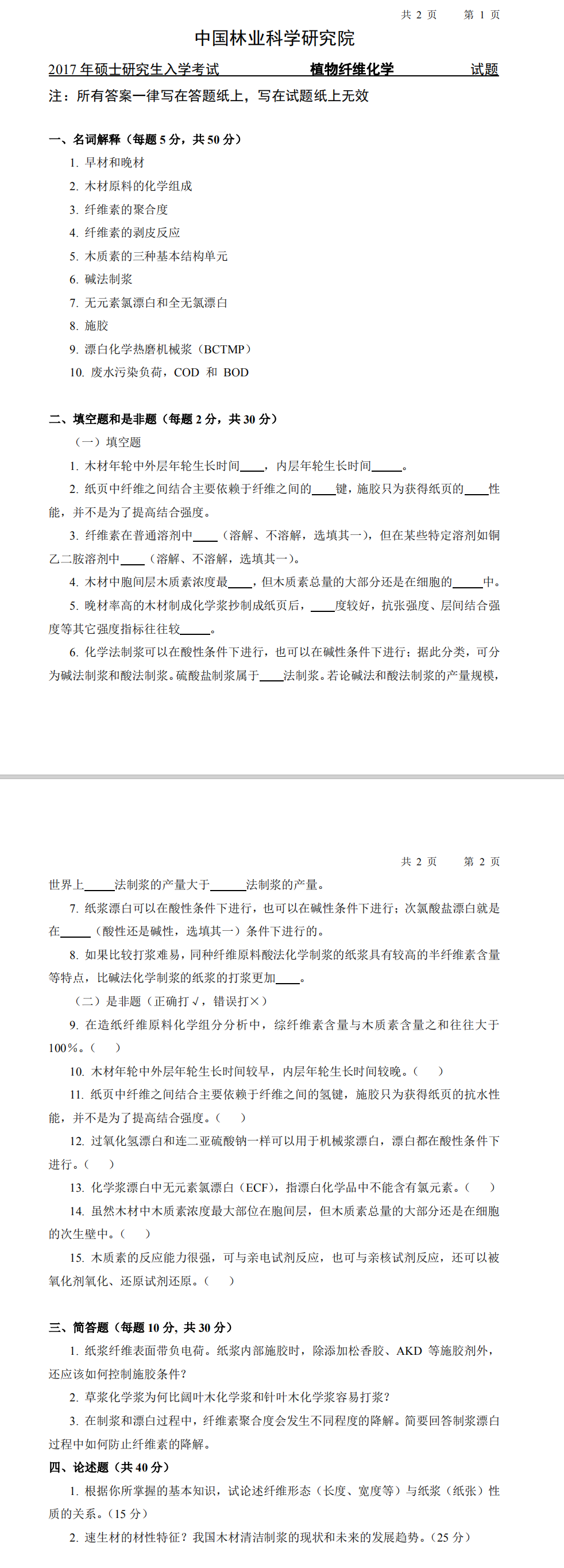 林科院考研辅导班:2017年中国林业科学研究院考研专业课807植物纤维化学考试真题