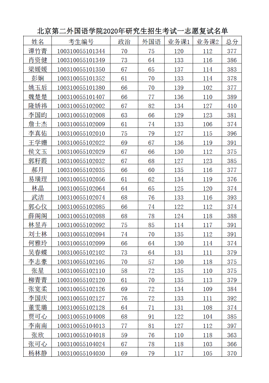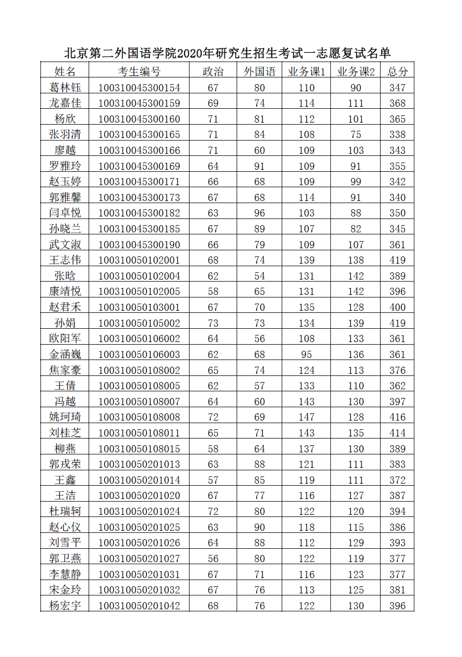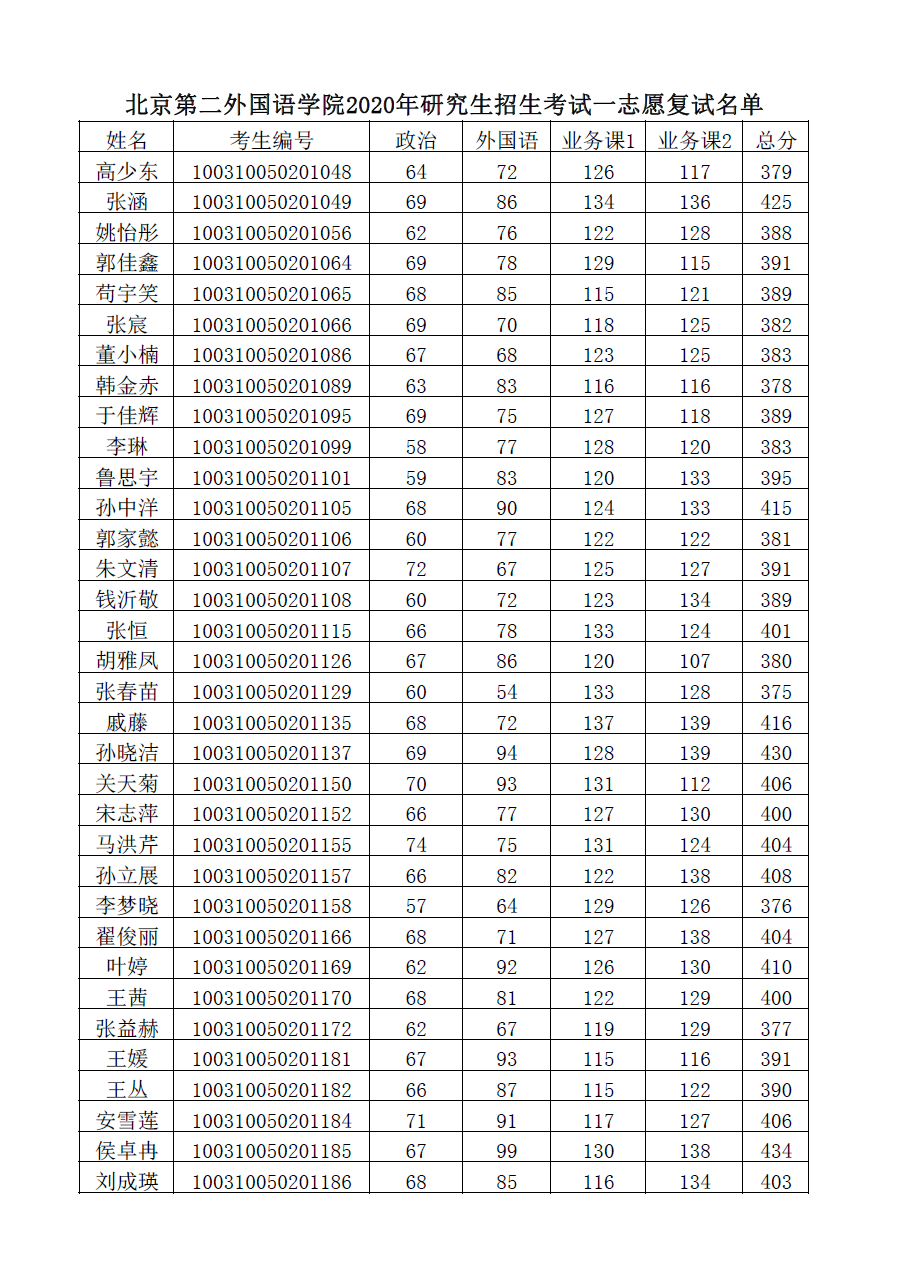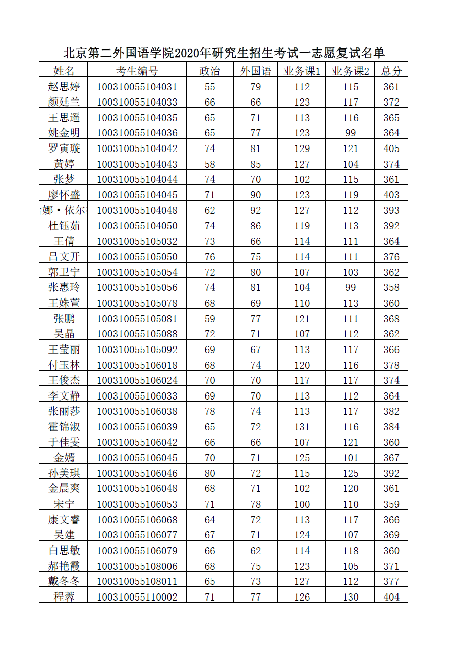 北京第二外国语学院考研辅导班:北京第二外国语学院2020年研究生招生考试一志愿复试名单