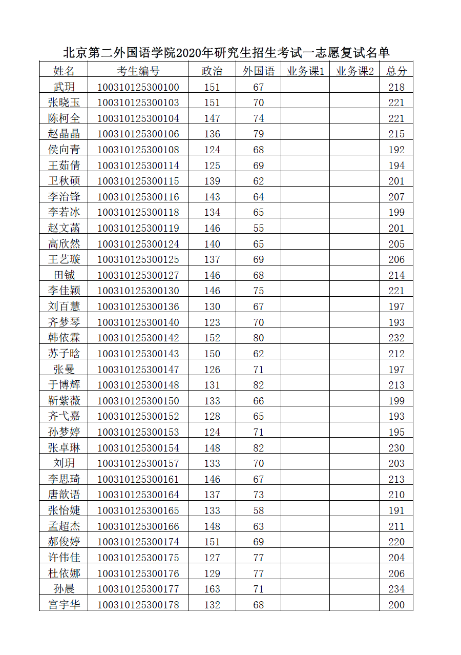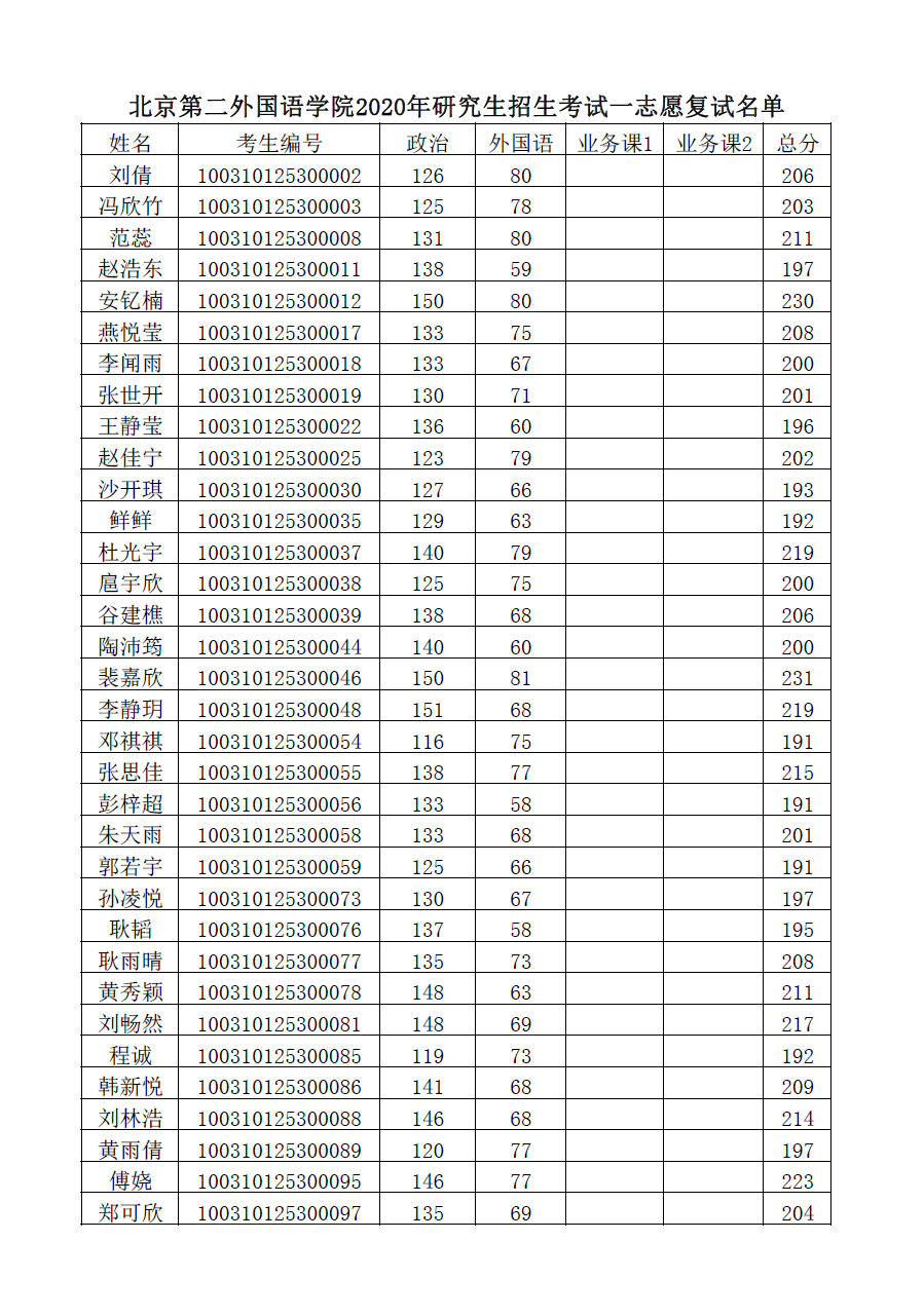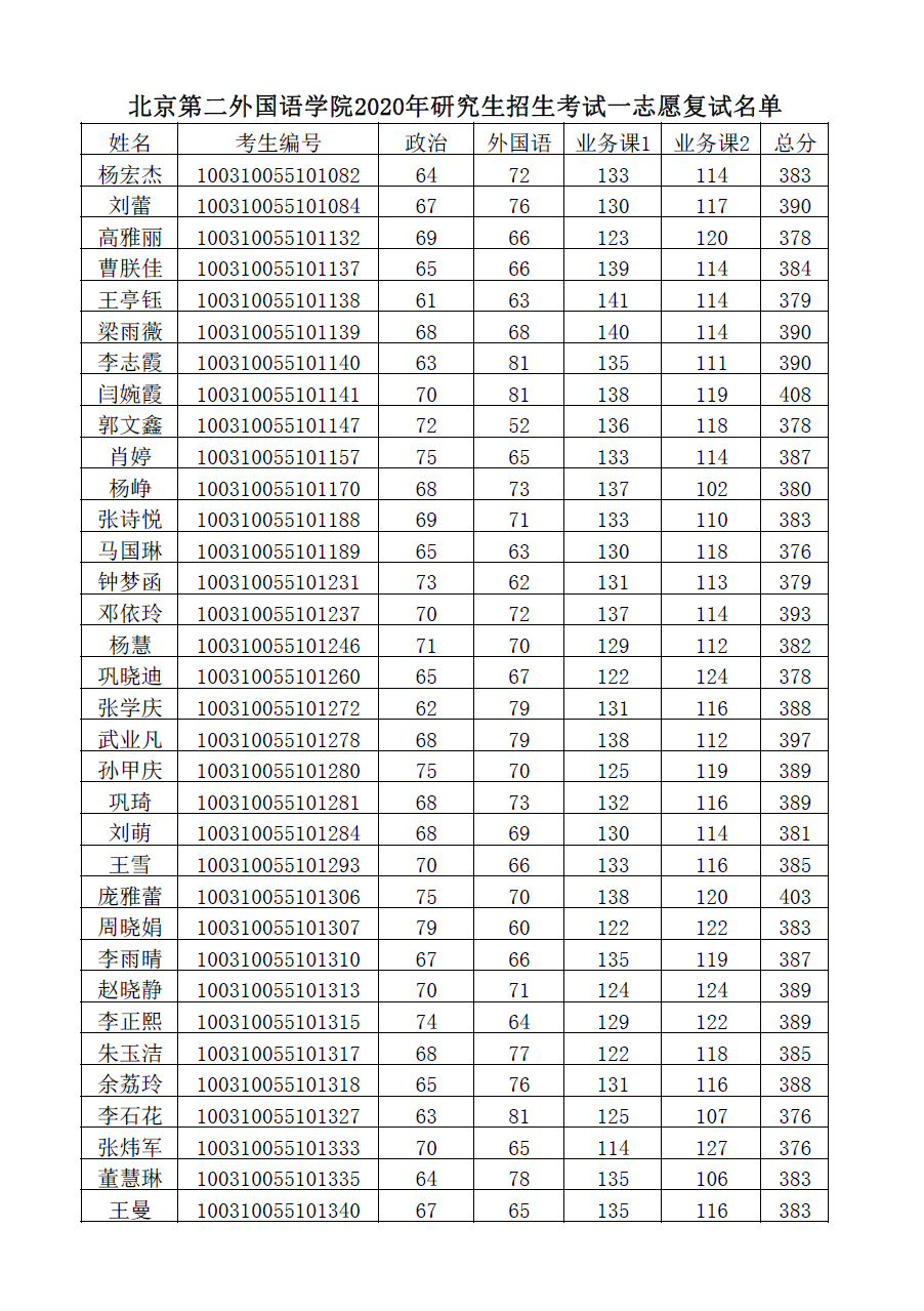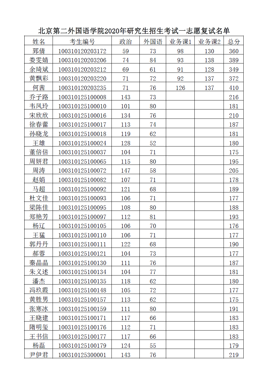 北京第二外国语学院考研辅导班:北京第二外国语学院2020年研究生招生考试一志愿复试名单