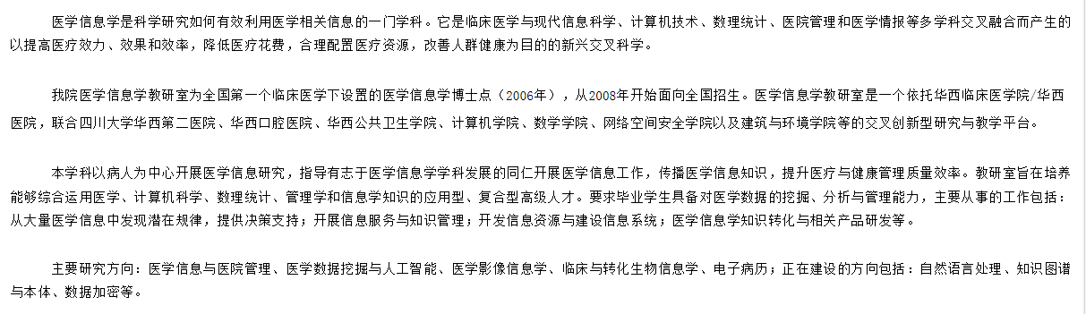2020年四川大学华西临床医学院医学信息学考研学科介绍