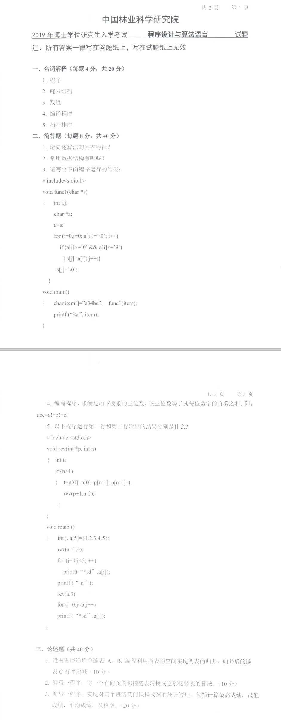 林科院考博辅导班:2019年中国林业科学研究院博士研究生入学考试3011程序设计与算法语言考试真题
