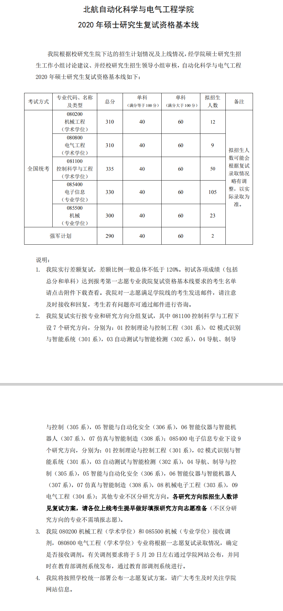 北航考研辅导班:2020年北京航空航天大学自动化学院研究生考研一志愿复试分数线及拟招生人数