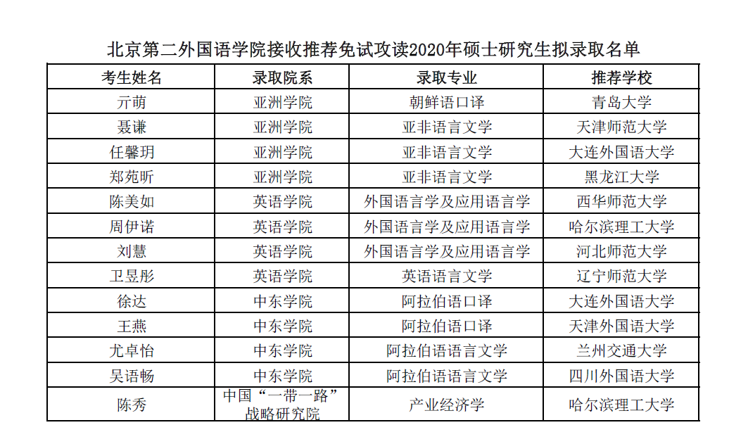 北京第二外国语学院考研辅导班:北京第二外国语学院接收推荐免试攻读2020年硕士研究生拟录取名单
