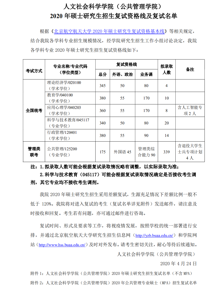 北航考研辅导班:2020年北京航空航天大学人文社会科学学院考研复试分数线及拟招生人数
