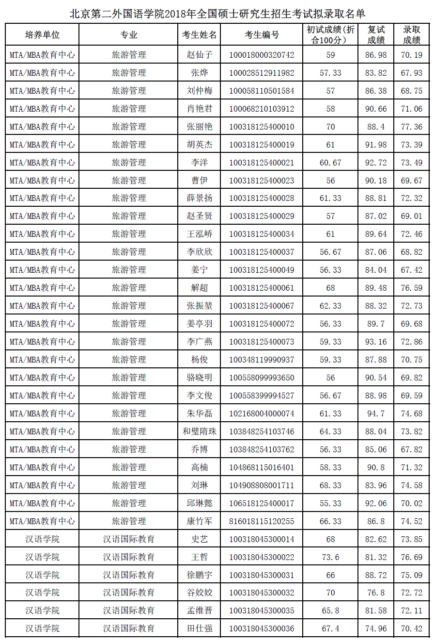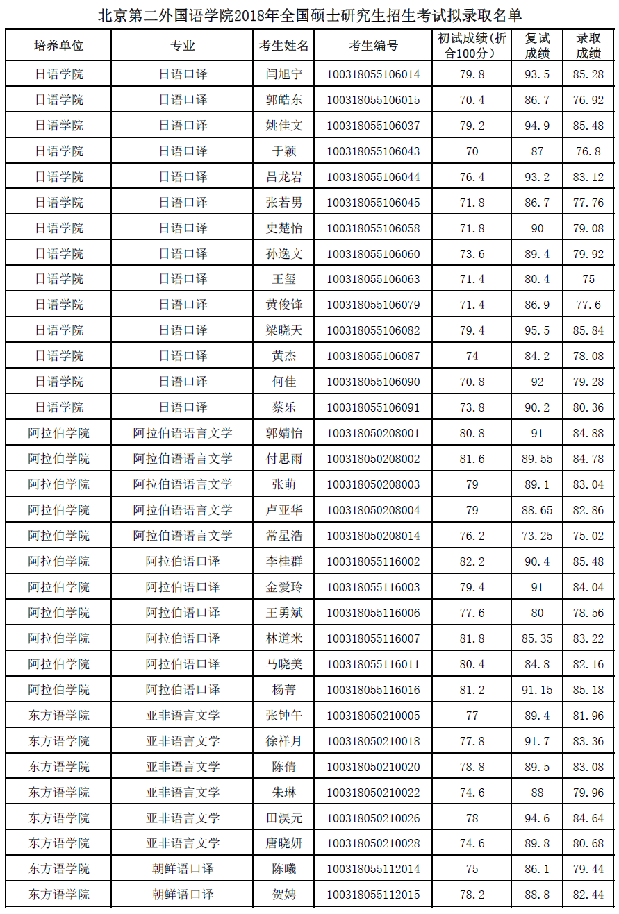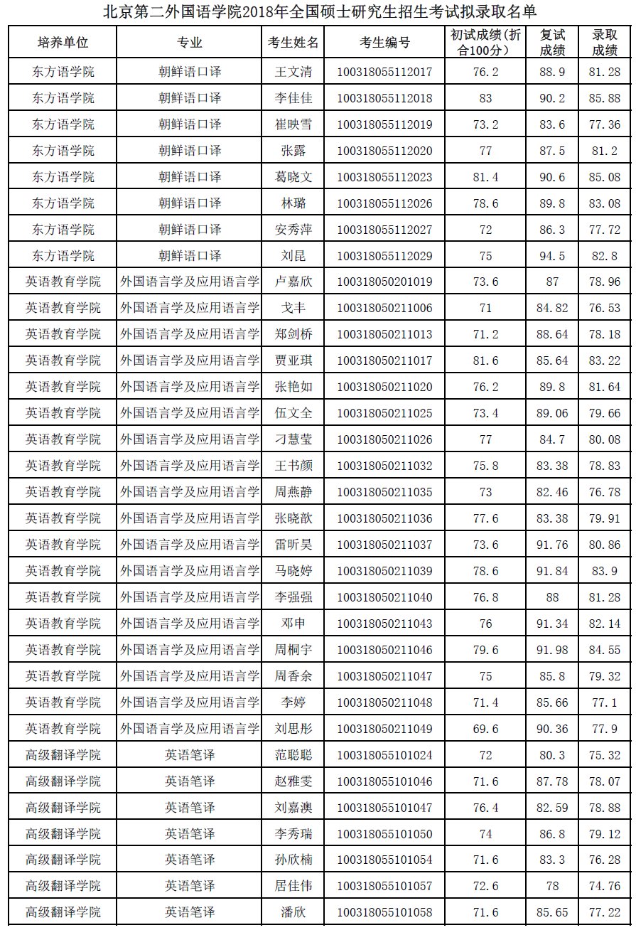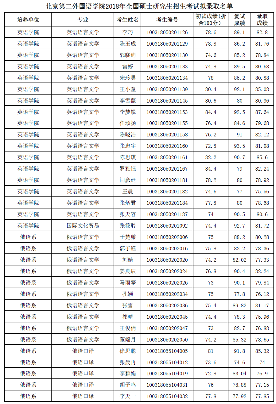 北京第二外国语学院考研辅导班:北京第二外国语学院2018年全国硕士研究生招生考试拟录取名单