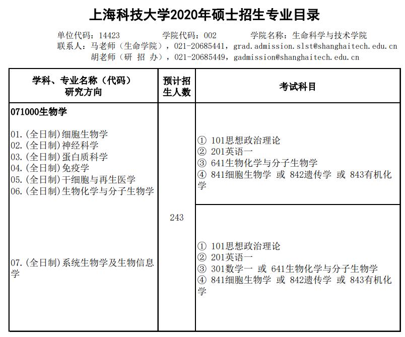上科大考研辅导班:2020年上海科技大学生命科学与技术学院硕士招生专业目录