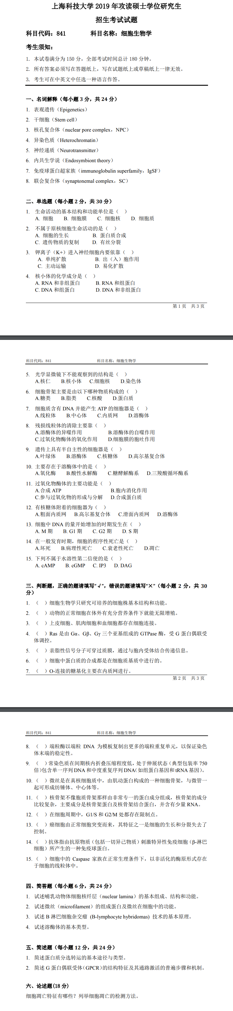 上科大考研辅导班:2019年上海科技大学硕士招生考试841细胞生物学专业课考试真题
