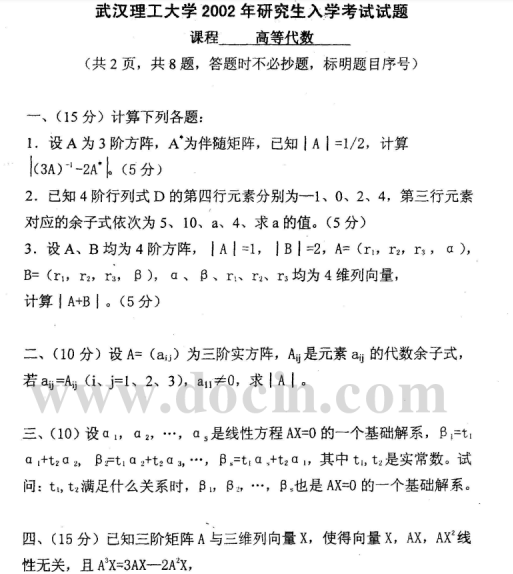 2020-2021年武汉理工考研辅导班:武汉理工大学817高等代数2002年考研真题