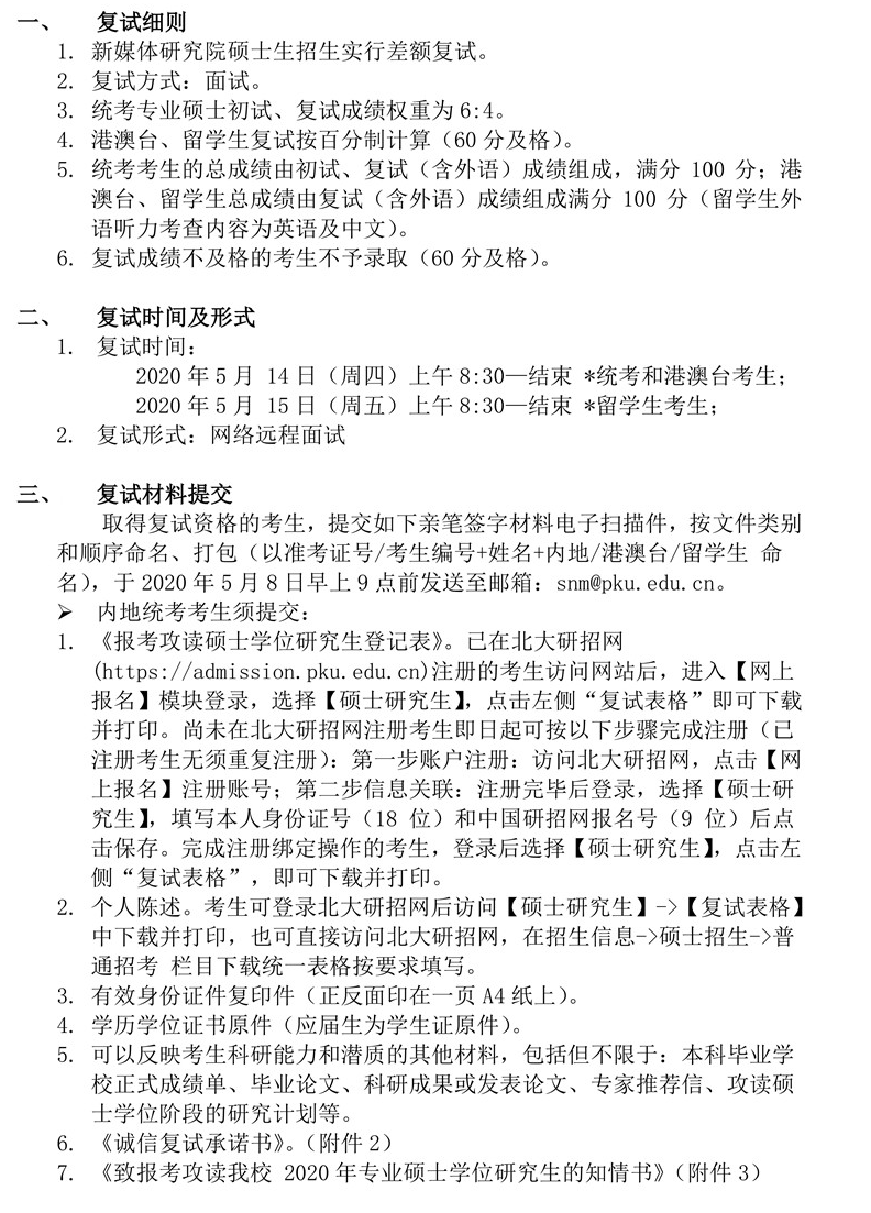 北大考研辅导班:2020年北京大学​​新媒体研究院硕士研究生复试分数线、复试名单等复试细则
