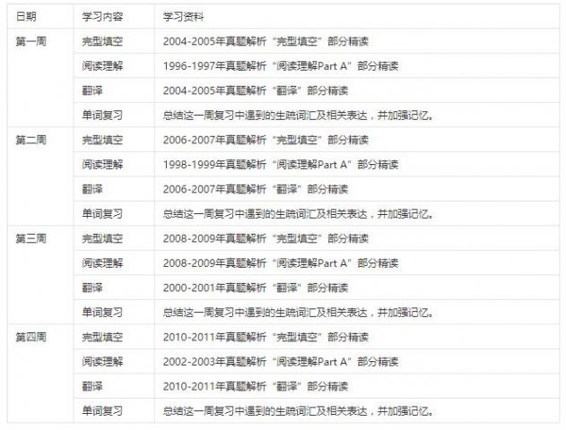 1、完成2004-2011年真题"完型"部分的学习,掌握其中所有词汇、短语及语法点,重点突破词汇间的辨析及搭配关系;