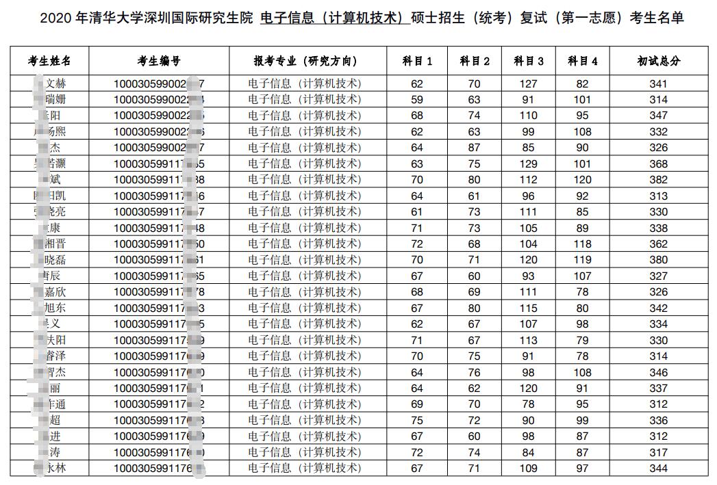 清华大学考研辅导班:2020年清华大学深圳国际研究生院电子信息(计算机技术)硕士招生考研复试一志愿考生名单