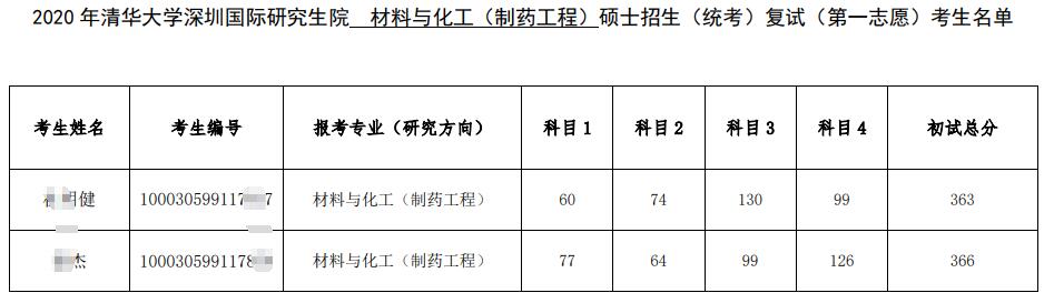 清华大学考研辅导班:2020年清华大学深圳国际研究生院材料与化工(制药工程)硕士生考研复试一志愿考生名单