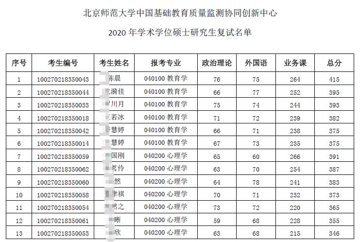 北师大考研辅导班:2020年北师大中国基础教育质量监测协同创新中心考研复试名单