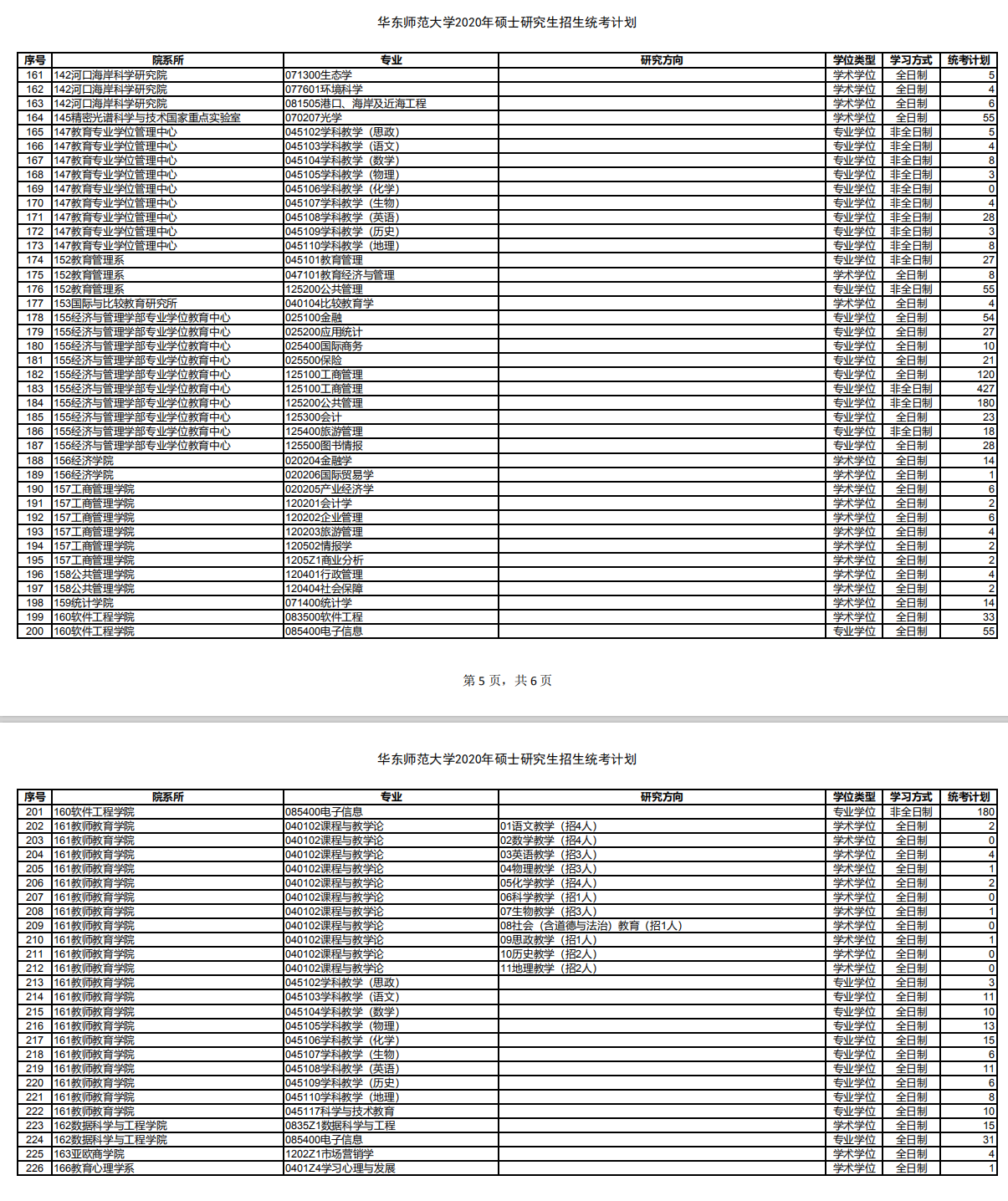 现将华东师范大学2020年硕士研究生招生计划公布,本表数据不含已录取的推免生,不含“少数民族高层次骨干人才”计划和“退役大学生士兵”计划,不含上海市“教硕-规培”计划,但是含未完成招生计划的部分专项计划(如“中法联合培养”专项计划、“上海纽约大学兼职导师招生”专项计划等)。