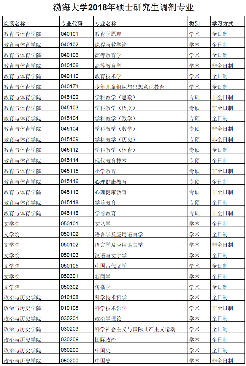 渤海大学考研辅导班:渤海大学2018年硕士研究生调剂专业
